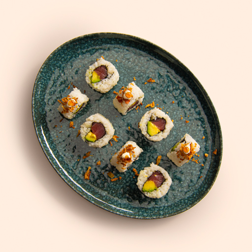 ATÚN,AGUACATE,PEPINO,SALSA TERIYAKI,MAYONESA Y CEBOLLA FRITA