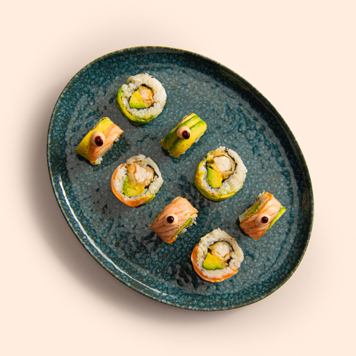SALMÓN FLAMBÉ,AGUACATE,LANGOSTINO REBOZADO SALSA SPICY Y SALSA ANGUILA
